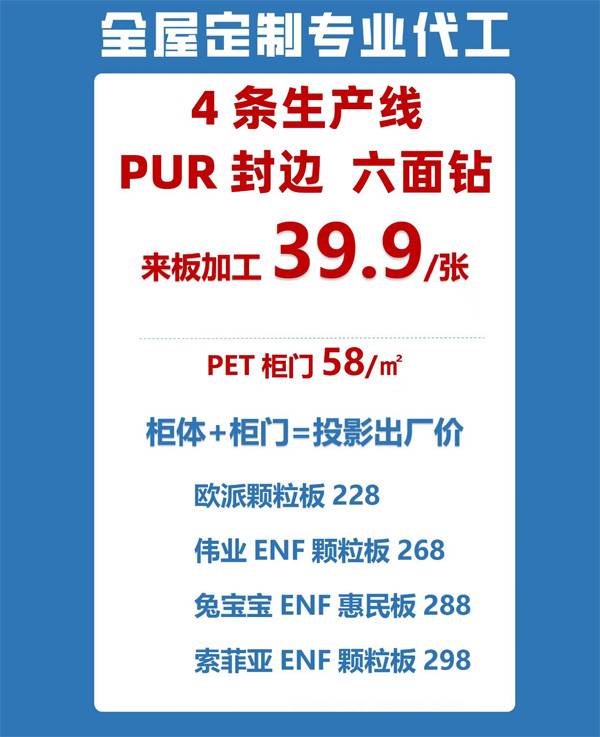 全屋定制专业代工4条生产线 PUR 封边 六面钻 39.9/张,PET 柜门 58/平代工PUR 封边 六面钻 39.9/张PET柜门 58/平欧派颗粒板 228伟业 ENF 颗粒板 2 -